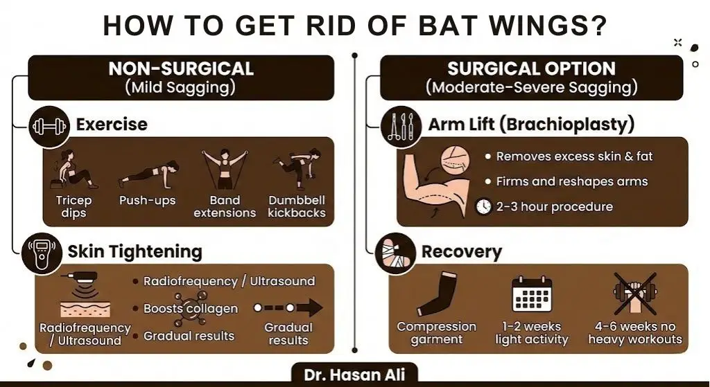 Safety should always be a top priority when deciding how to get rid of bat wings on your arms. Choosing a qualified plastic surgeon significantly impacts both results and recovery.